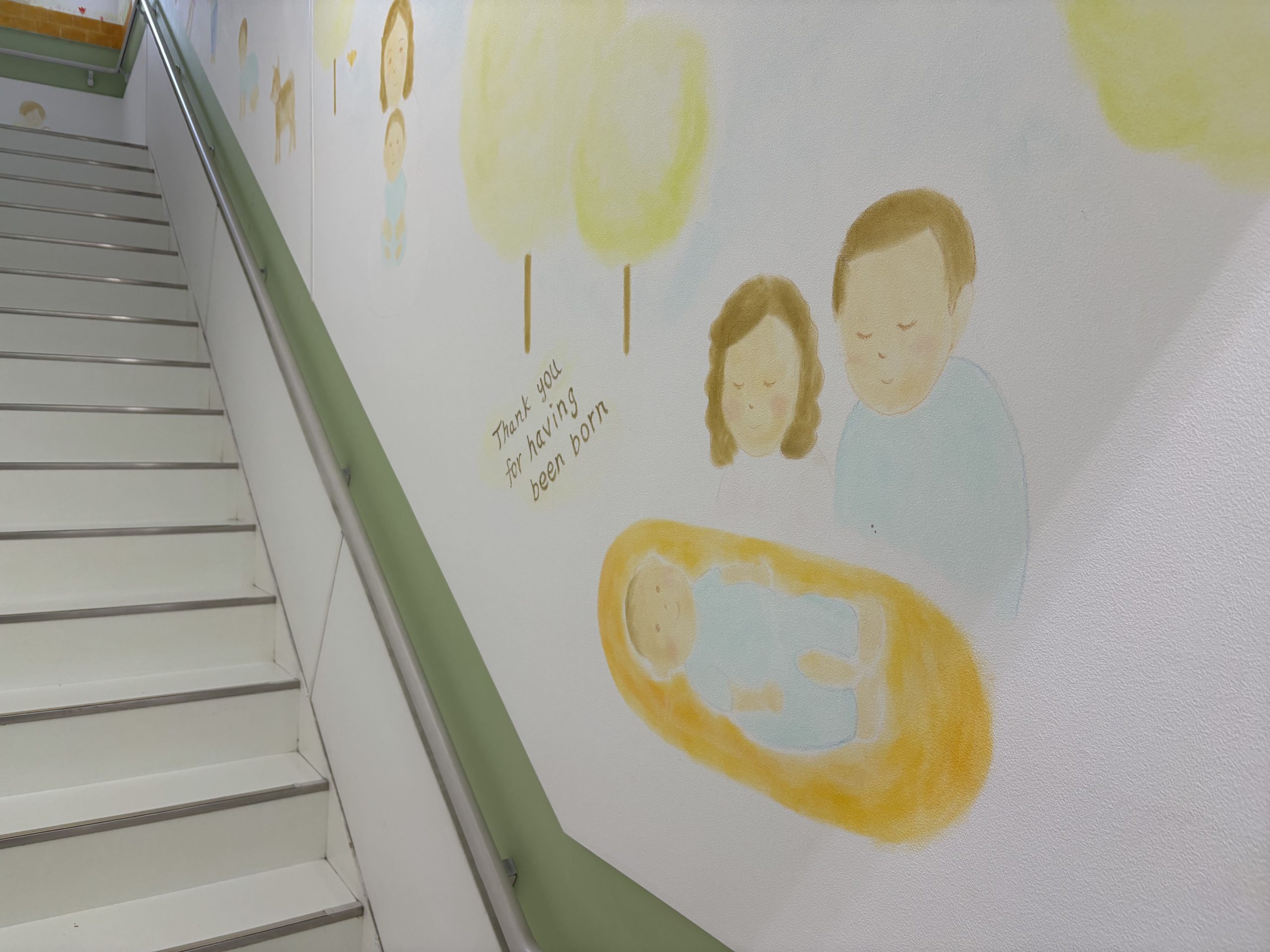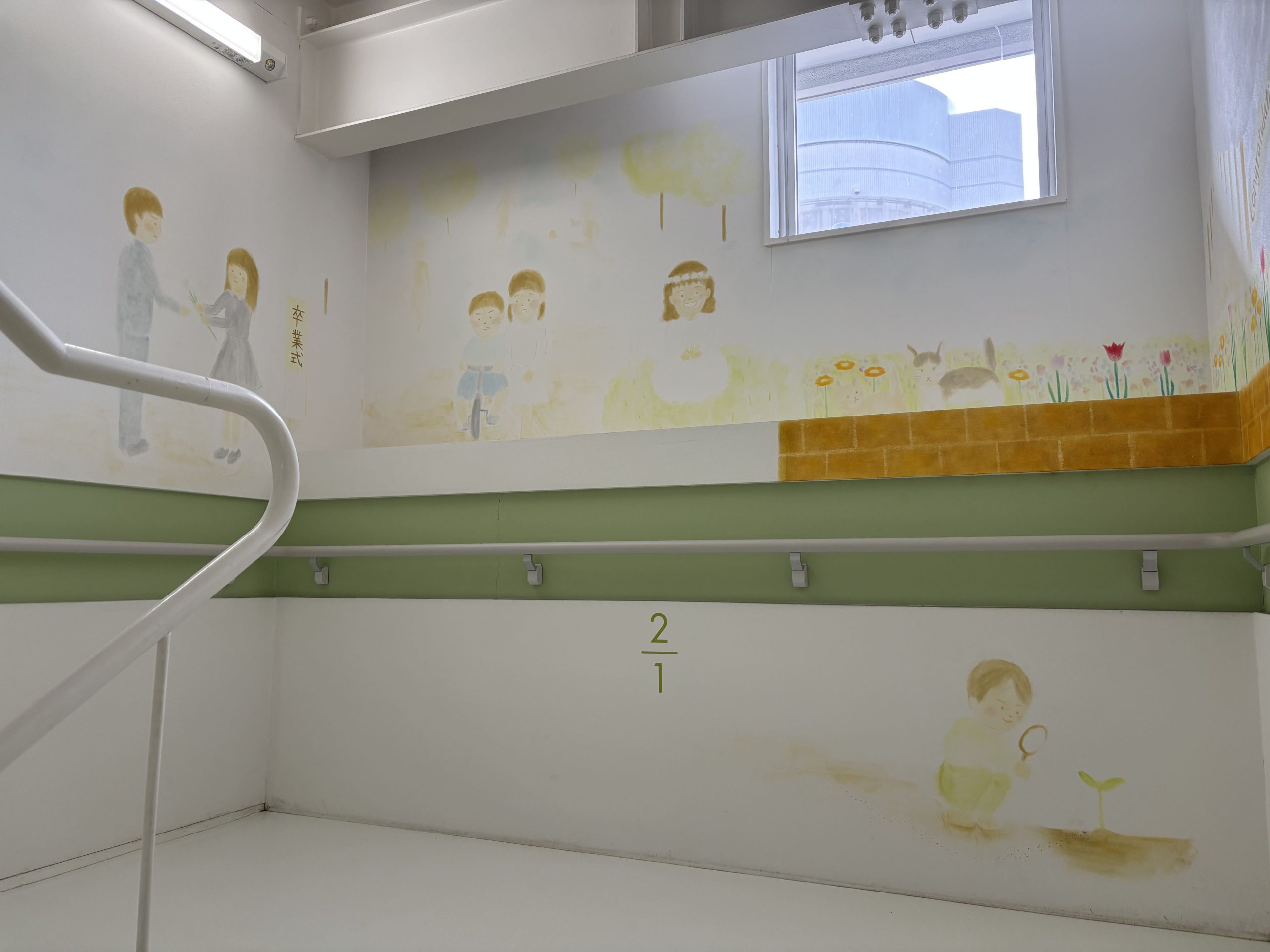 入口から2階に上がる階段で、早速素敵な壁のイラストがお出迎え。